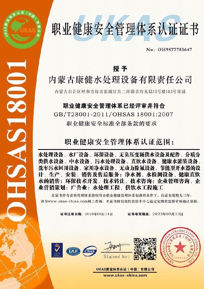 職業健康安全管理體系認證證書